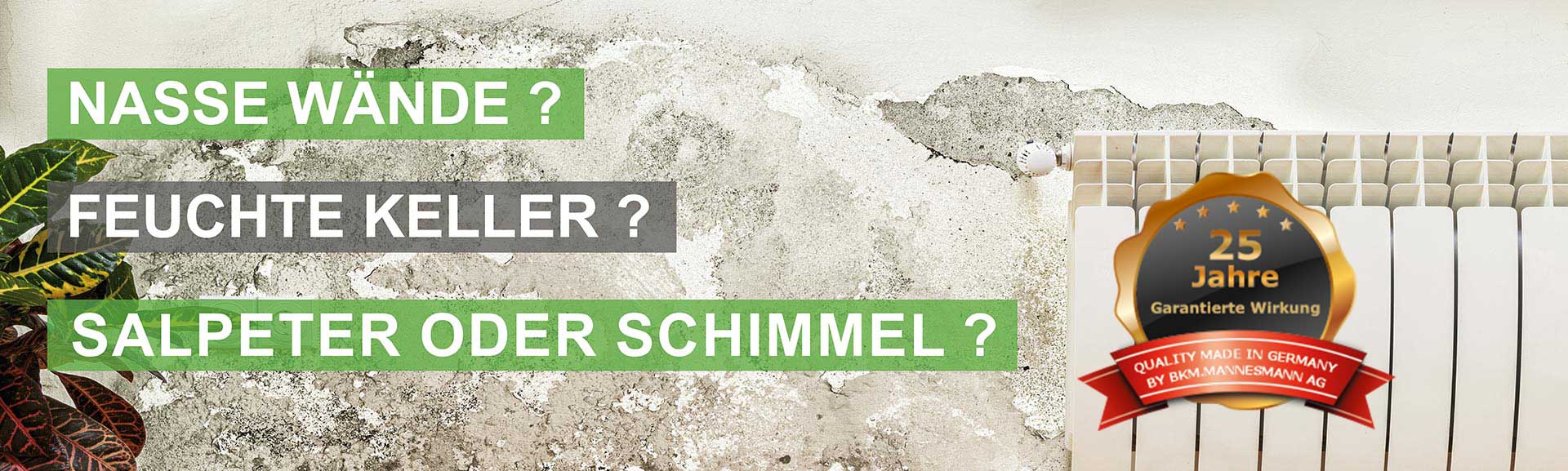 Die Lösung: das gesundheitlich unbedenkliche, hydrophobierende Injektionsverfahren der BKM.MANNESMANN AG. Fachgerechte & dauerhafte Austrocknung des Mauerwerks, auch bei starker Durchfeuchtung, mit 25 Jahren Garantie durch die Ausführung unserer Fachbetriebe!